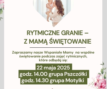 RYTMICZNE GRANIE- Z MAMĄ ŚWIĘTOWANIE Drogie Mamy! z okazji zbliżającego się Dnia Mamy serdecznie zapraszamy Was na wspólne świętowanie podczas zajęć rytmicznych, które odbędą się:22 maja (czwartek ) o godzinie 14:00 w grupie Pszczółek i o godz...